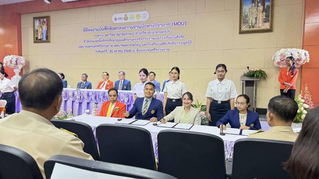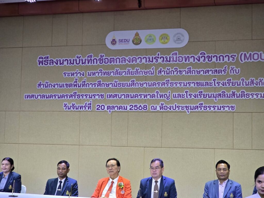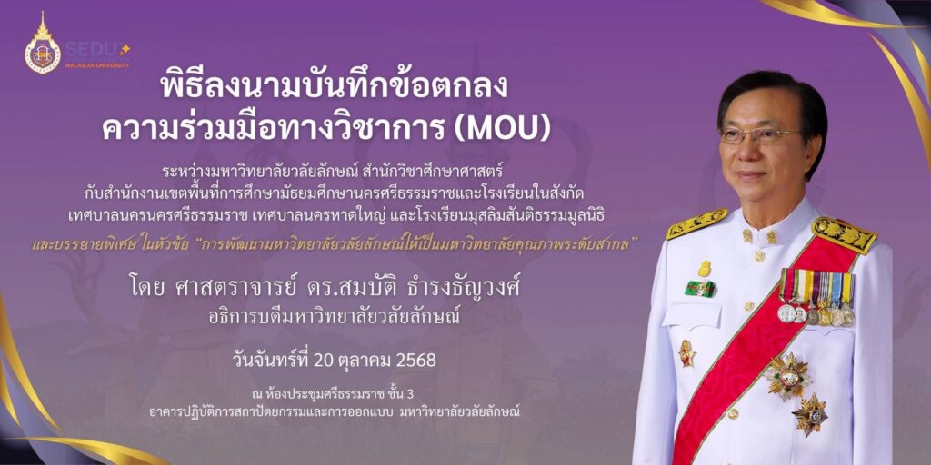 ได้ร่วมพิธีลงนามบันทึกข้อตกลงความร่วมมือทางวิชาการ (MOU) ระหว่าง มหาวิทยาลัยวลัยลักษณ์ สำนักวิชาศึกษาศาสตร์ กับ สำนักงานเขตพื้นที่การศึกษามัธยมศึกษานครศรีธรรมราชและโรงเรียนในสังกัดเทศบาลนครนครศรีธรรมราช