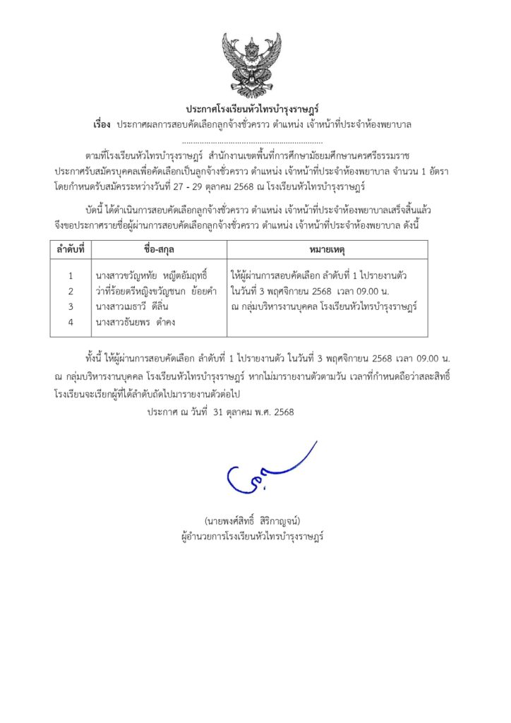 ประกาศผลการสอบคัดเลือกลูกจ้างชั่วคราว ตำแหน่ง เจ้าหน้าที่ประจำห้องพยาบาล