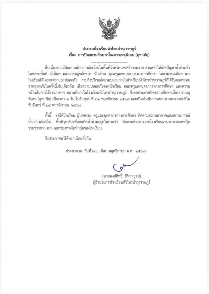 เรื่อง การปิดสถานศึกษาเนื่องจากเหตุพิเศษ (อุทกภัย)