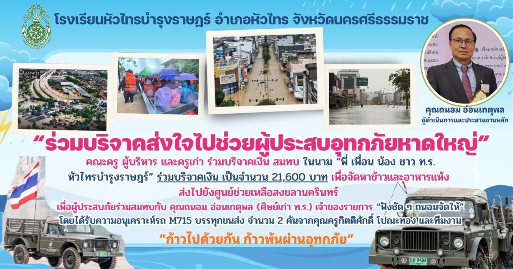 เพื่อจัดหาข้าวและอาหารแห้ง ส่งไปยังศูนย์ช่วยเหลือสงขลานครินทร์ เพื่อผู้ประสบภัยร่วมสมทบกับ คุณถนอม อ่อนเกตุพล (ศิษย์เก่า ท.ร.) เจ้าของรายการ “ฟังชัด ๆ ถนอมจัดให้”