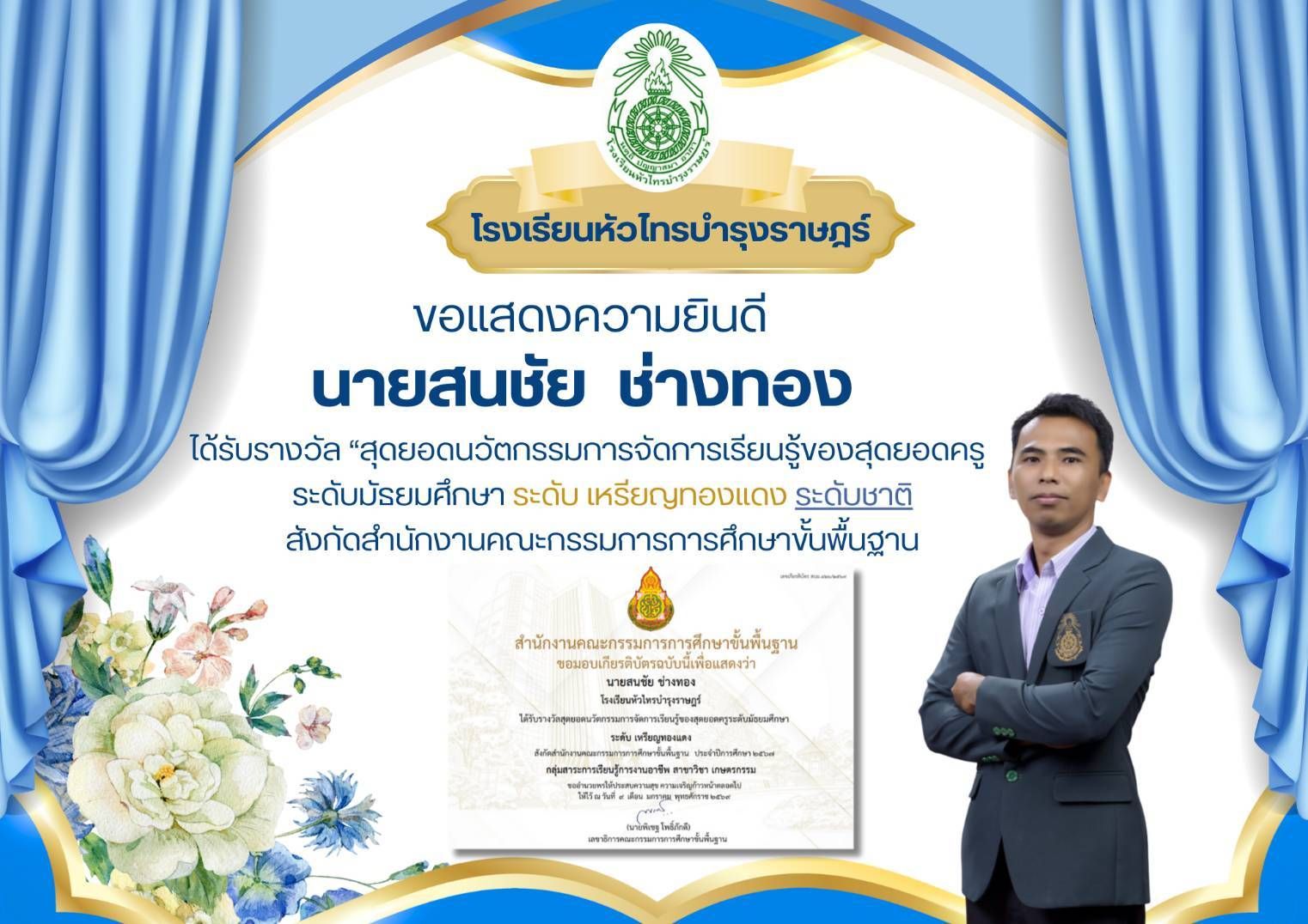 ขอแสดงความยินดี กับนายสนชัย ช่างทอง ได้รับรางวัล “สุดยอดนวัตกรรมการจัดการเรียนรู้ของสุดยอดครู ระดับมัธยมศึกษา ระดับ เหรียญทองแดง ระดับชาติ