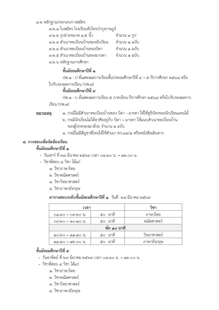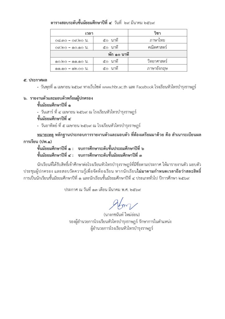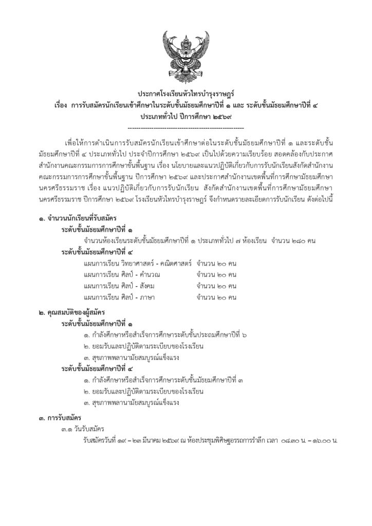 ประกาศโรงเรียนหัวไทรบำรุงราษฎร์ เรื่อง การรับสมัครนักเรียนเข้าศึกษาในระดับชั้นมัธยมศึกษาปีที่ 1 และ ระดับชั้นมัธยมศึกษาปีที่ 4 ประเภททั่วไป ปีการศึกษา 2569