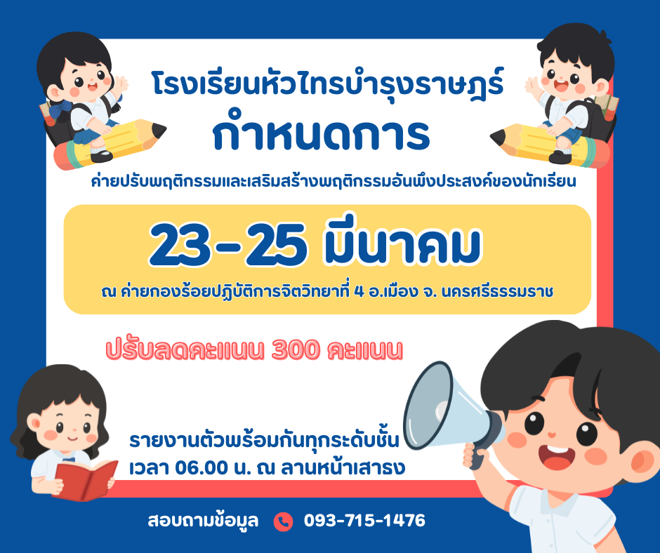 ข่าวประชาสัมพันธ์ประกาศโรงเรียนหัวไทรบำรุงราษฎร์ ผู้ชนะการประมูลสวัสดิการร้านค้าโรงเรียนหัวไทรบำรุงราษฎร์March 24, 2026March 24, 2026อ่านเพิ่มเติม