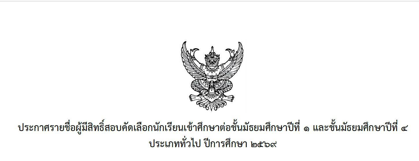 คลิก>>ประกาศรายชื่อผู้มีสิทธิ์สอบคัดเลือกนักเรียนเข้าศึกษาต่อชั้นมัธยมศึกษาปีที่ 1 และชั้นมัธยมศึกษาปีที่ 4 ประเภททั่วไป ปีการศึกษา 2569
