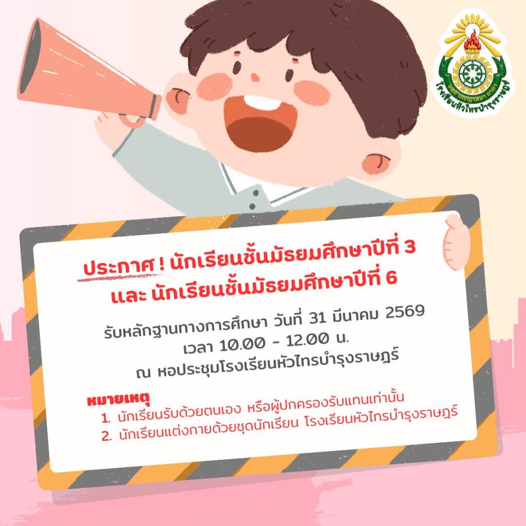 ข่าวประชาสัมพันธ์รายละเอียดการมอบตัวนักเรียน ชั้นมัธยมศึกษาปีที่ 4 ปีการศึกษา 2569April 4, 2026April 4, 2026อ่านเพิ่มเติม