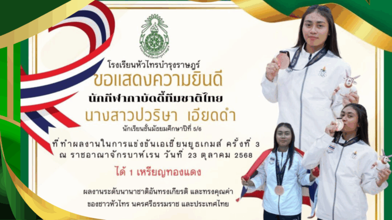 กลุ่มสาระการเรียนรู้สุขศึกษาและพลศึกษาข่าวกิจกรรมรางวัลแห่งความภาคภูมิใจโรงเรียนหัวไทรบำรุงราษฎร์ ขอแสดงความยินดีนักกีฬากาบัดดี้ทีมชาติไทยนางสาวปวริษา เอียดดำ นักเรียนชั้นมัธยมศึกษาปีที่ 5/6October 24, 2025October 24, 2025อ่านเพิ่มเติม