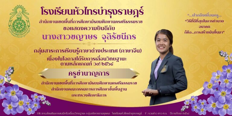 ขอเเสดงความยินดีกับ คุณครูชญาษร จุลิรัชนีกร เนื่องในโอกาสได้รับการเลื่อนวิทยฐานะเป็น ครูชำนาญการJanuary 26, 2026January 26, 2026อ่านเพิ่มเติม
